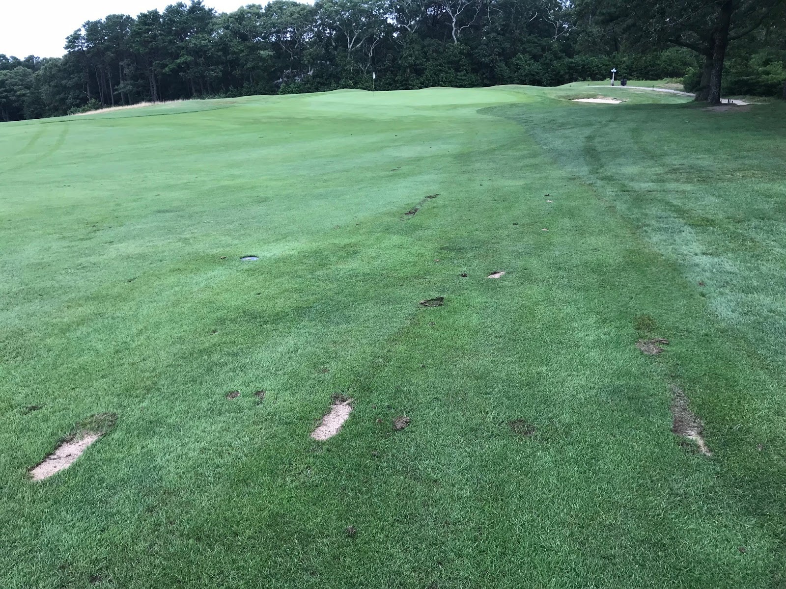 Speaking of damage. Our salt water intrusion was high again this summer and it shows by how slimy the soils are. Think of a pile of ice melt spilled on the driveway or the salt in your shaker. The salt builds up and then pulls moisture out of the air keeping the surface moist and soft. This means it is easier to take a divot and in some areas the turf will simply peel up from any aggressive cart traffic. Please use caution with carts and try to avoid excessive turning and driving around until we can flush the salts from the surface. I will apply a gypsum application which will help with the flush.